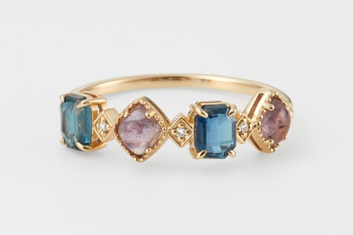 ダイヤモンドやサファイアといった定番の貴石だけでなく、ラブラドライト、アクアマリン、ハーキマーダイヤモンド、ターコイズなどの半貴石を日常に馴染むようデザイン。石選びからカッティングまでこだわった大胆な石使いは、鉱物好きの心も掴んでいます。
