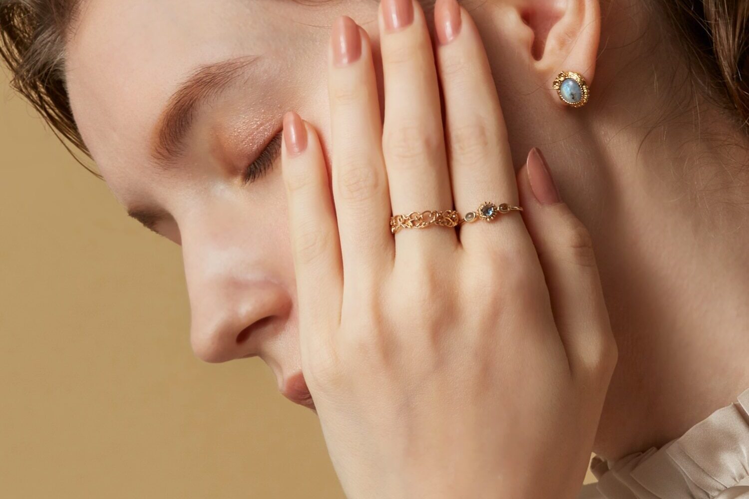 細めのデザインが多いため、複数のリングを重ね付けしても、ごちゃごちゃした印象になりません。むしろ、重ね付けすることで、より華やかで個性的な印象になります。