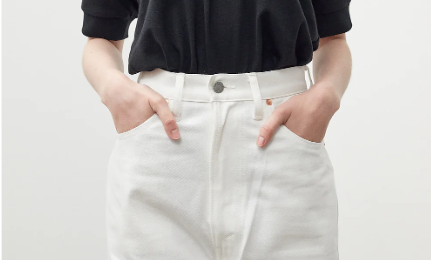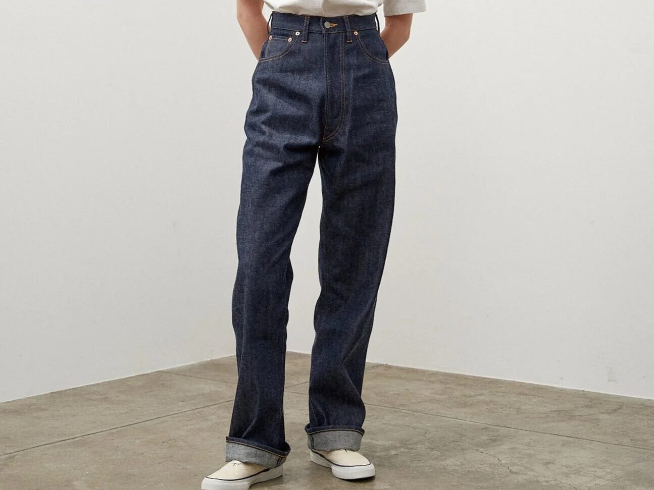 生地には、オリジナルに近づけるため薄く軽めの11オンスの耳付きデニムを使用。履き込んだような柔らかく軽い素材感で、スカートのような楽ちんな着心地が特徴です。太もも周りはゆったりとしているのにヒップラインがすっきりしていて、とても綺麗なシルエットを作り出してくれます。