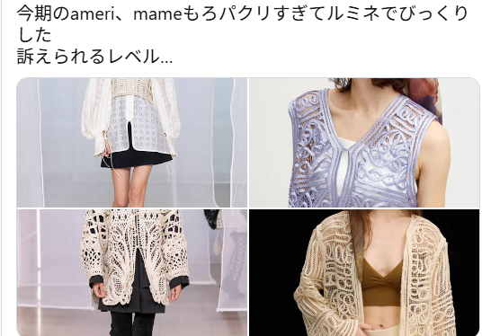 特に注目されたのが、日本を代表するデザイナーズブランド「Mame Kurogouchi」との類似性です。武庫川女子大学の卒業研究論文で「アパレルにおける模倣とパクリの現状と問題−Ameri. VINTAGE とMame Kurogouchi に着目して−」というテーマで学術的に分析されるほど、根深い問題として認識されています。