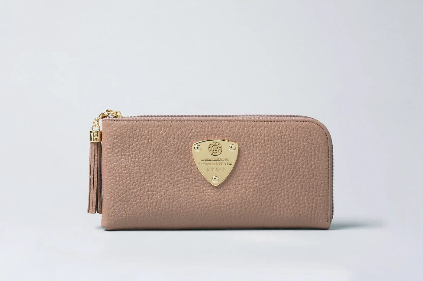 シンプルながらも他にはない、アタオだけのオリジナリティ溢れるデザイン性が非常に魅力的で、見る人を惹きつけます。デザインの特徴は、ブランドロゴが刻印されたゴールドプレートが飾られていること。使われているレザーはさまざまで、豊富なカラーバリエーションがそろっています。