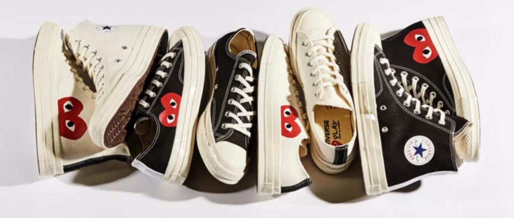 また、PLAYラインのスニーカー(コンバースとのコラボ)も人気。カジュアルなスタイルに、さりげなくブランドのエッセンスを加えられます。