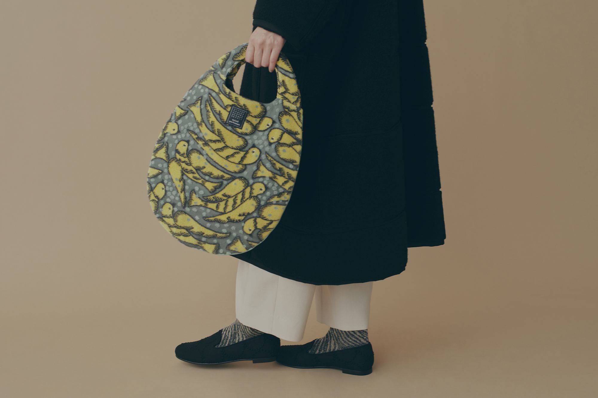 卵型のシンプルで可愛いデザインは、余り布を最大限活かす形状として考案されたもの。毎シーズン新しい柄が発表され、タンバリンやchouchoなど人気のテキスタイルがバッグの魅力をさらに引き立てます。