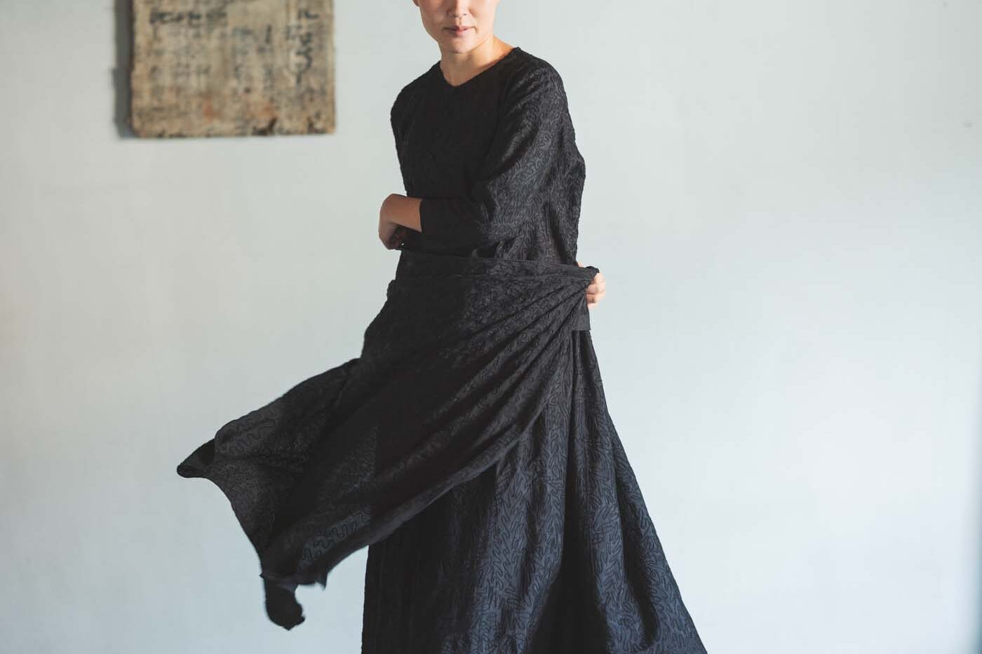 首元のラインやウエストのタック使い、ポケットの配置まで、実用性と美しさを兼ね備えたデザインになっています。ドルマンスリーブやドレープ感のあるシルエットのワンピースは、動くたびに生地がふわっと揺れて、シンプルながらも「特別感」を感じさせてくれます。