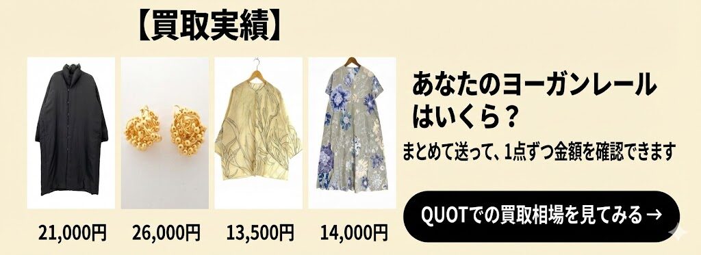 査定の現場でも、10年以上前のヨーガンレールのワンピースが状態良く持ち込まれることがあります。特にウールやシルク混のワンピースは、ケア次第でシーズンをまたいで何年も着られるアイテムです。