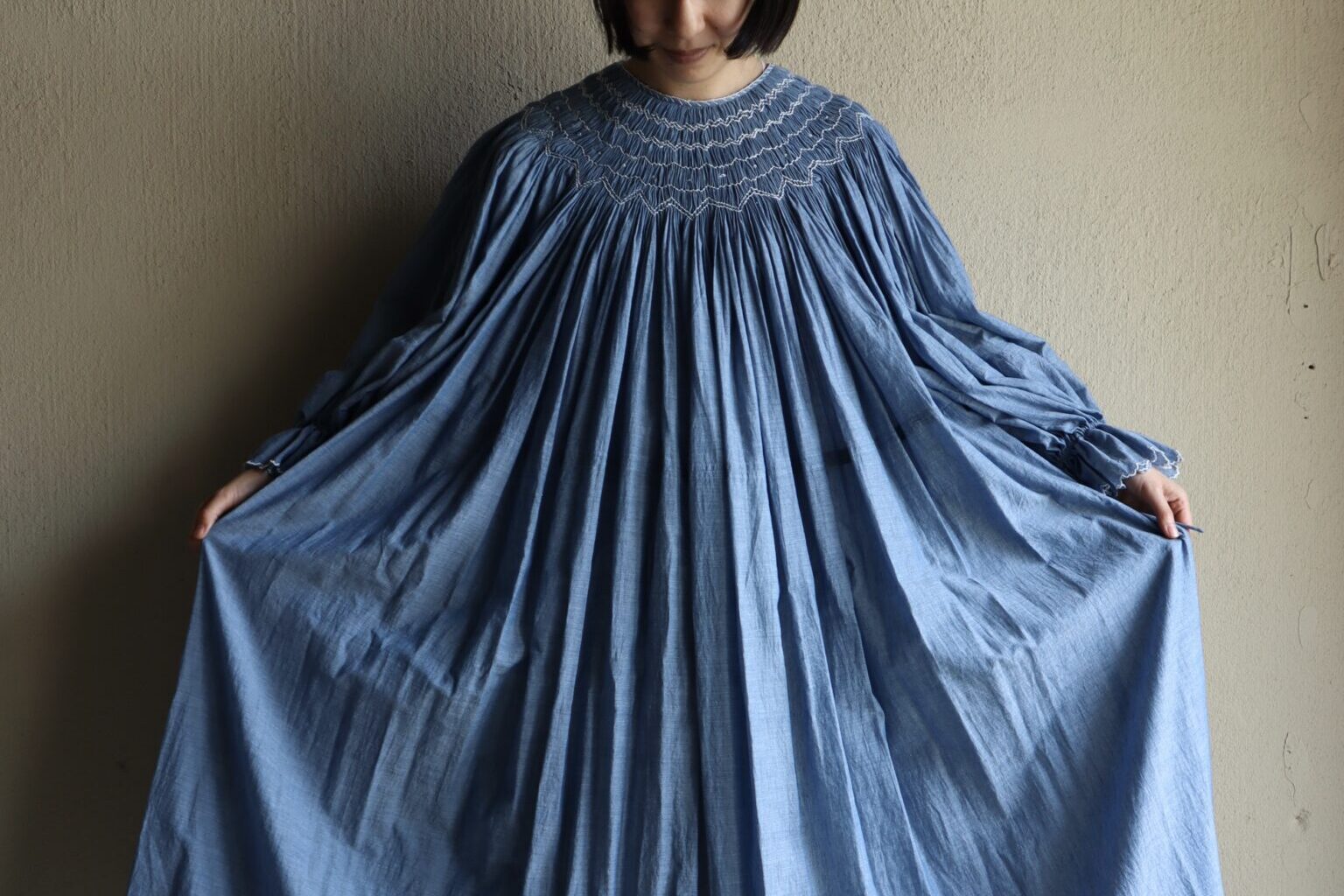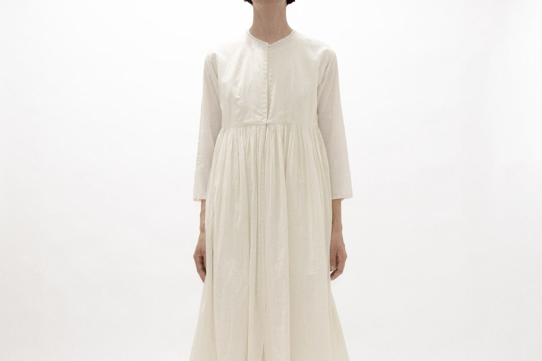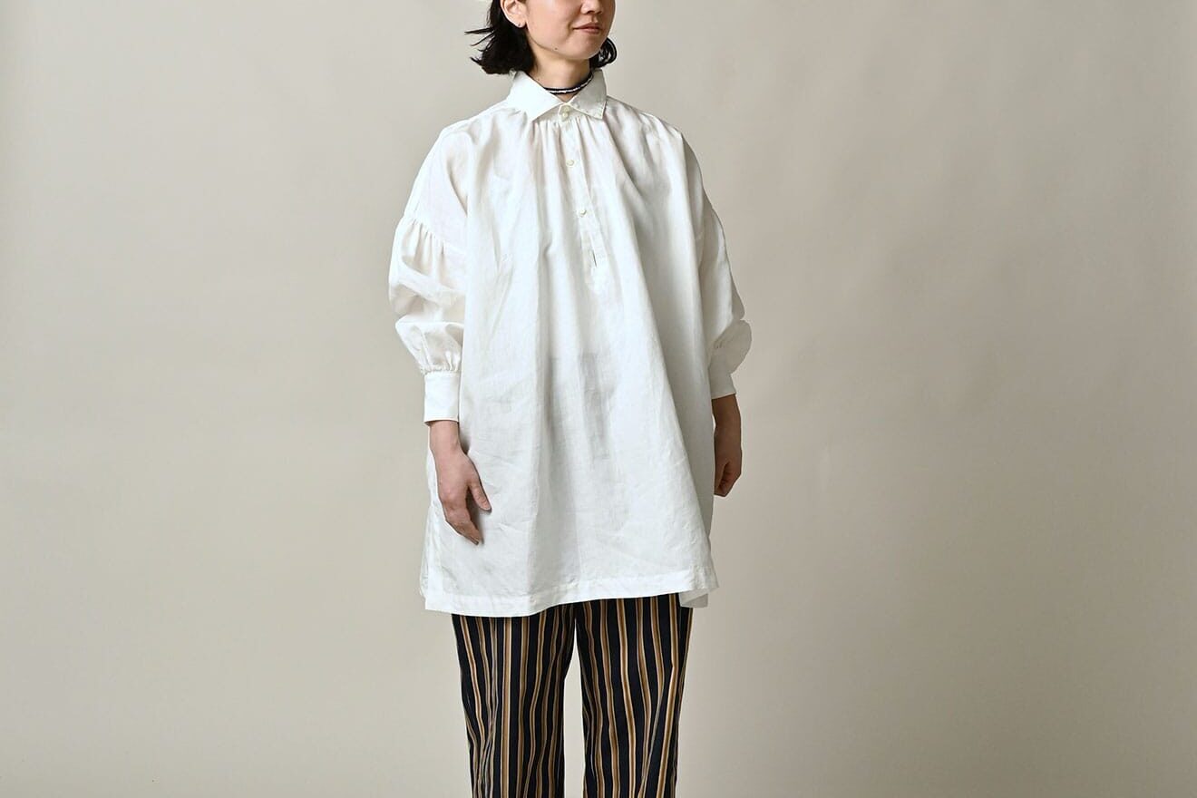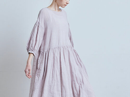 査定で手に取ると、TOWAVASEは45Rよりもフェミニンな印象です。ギャザーやタックといったディテールが多く、女性らしいシルエット。でも、素材はリネンやカディコットンなど、45Rと共通するものが多い。手織りの風合いが楽しめるブランドです。