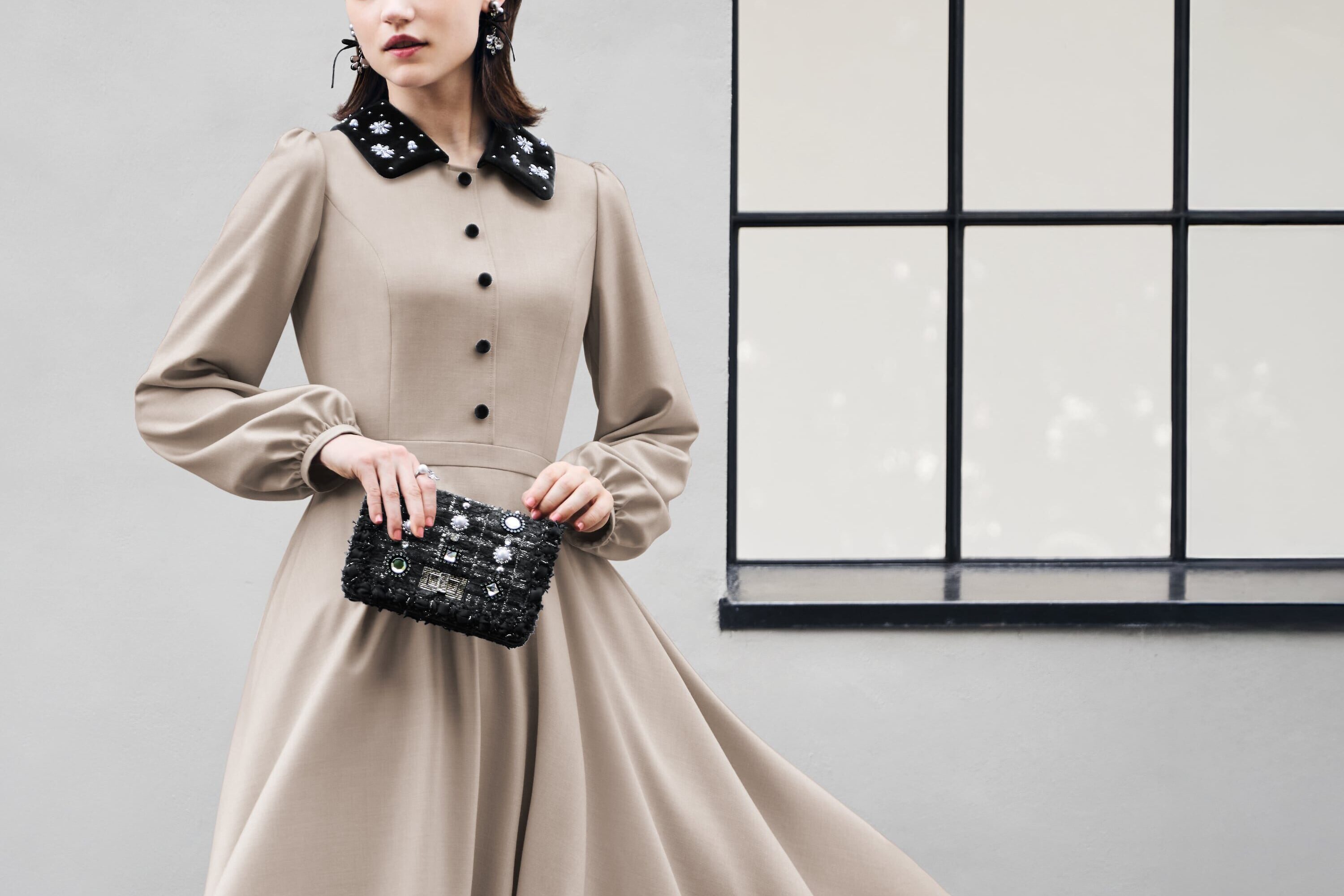 パールやビジュー、フラワーデザインなど女性らしいポイント素材や柄を使いつつも、全体のシルエットはシャープにまとめられているデザインが多く、大人の女性が着ても違和感のないシルエットになっています。